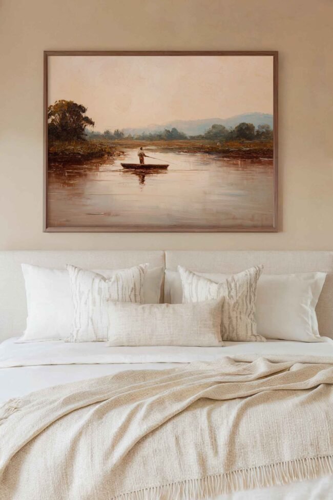 Create your own gallery wall by mixing prints with similar tones — greens, blues, browns, and neutrals blend perfectly to form a soothing visual story. Combine large and small nature prints for balance, and use oak or light wood frames to highlight the earthy character of each piece.
