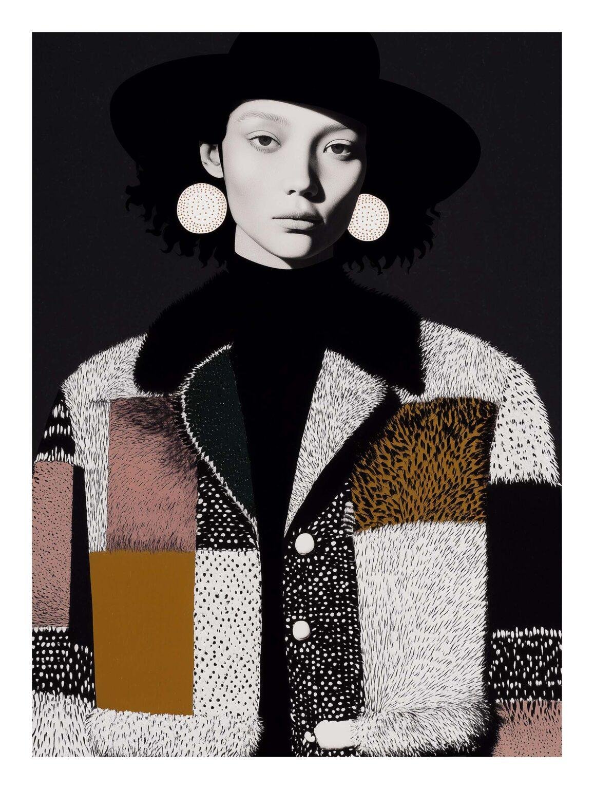 This art print shows a modern, fashion-inspired portrait of a woman wearing a wide-brimmed hat and oversized polka-dot earrings. She wears a richly textured patchwork coat with bold patterns in muted earthy tones. The deep black background makes the colors stand out, creating a minimal yet dramatic look.