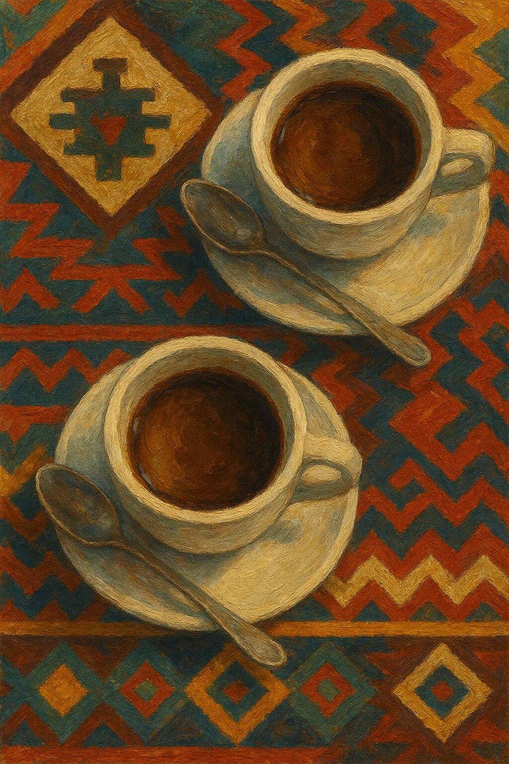 A warm and cozy coffee-themed poster featuring two espresso cups on a colorful woven textile with subtle bohemian patterns. Earthy tones and soft textures give the artwork a relaxed, handcrafted feel. A perfect piece to bring warmth and charm to kitchens, dining areas, cafés, or your coffee corner.