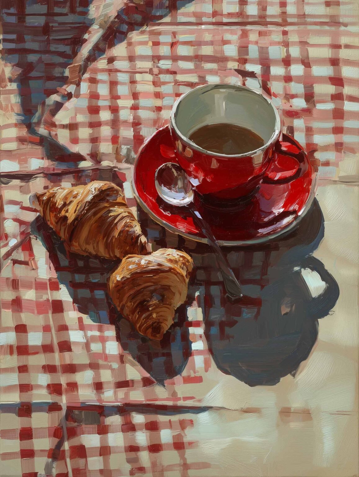 A cozy morning scene with a red coffee cup and buttery croissants on a checkered tablecloth. The painterly style and soft colors bring a touch of French café charm to your kitchen or dining space.
