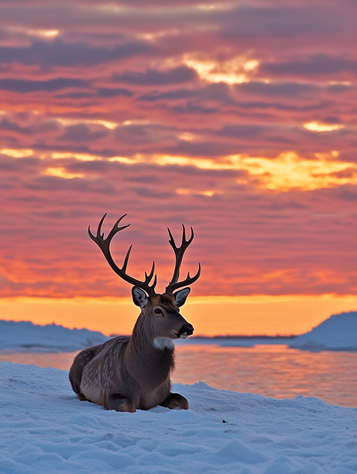 Artistic print showing a deer lying calmly on snowy ground. The sky glows with shades of orange, pink, and purple, creating a warm contrast against the winter landscape. Perfect for nature-inspired interiors, this high-definition photograph brings warmth, wilderness, and a sense of awe to any room.