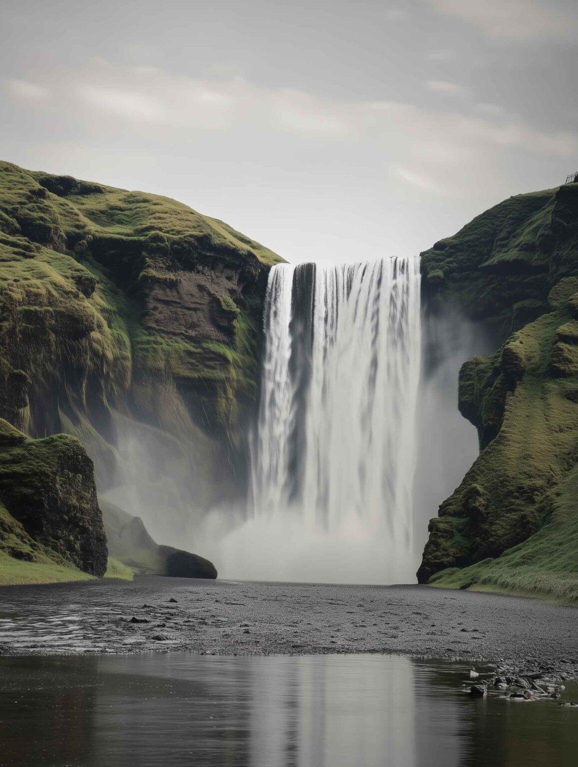 Graphical art with a cascading waterfall flowing through lush, moss‑covered cliffs. The poster shows soft mist rising where water meets stone against a gentle, overcast sky. Ideal nature print for adding a breath of Nordic tranquility to modern, minimalist, or nature-inspired interiors.