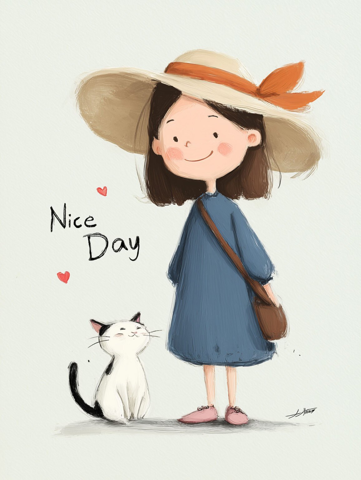 Smiling girl with hat and cat Illustration of a young girl in a wide-brimmed straw hat with an orange ribbon, wearing a simple blue dress and pink shoes. A small white cat with black spots sits next to her. Hand-drawn text Nice Day with little heart doodles on a soft, light background. Perfect for children’s rooms, nurseries, or cheerful corners of your home, this print brings lightness and joy to any space.