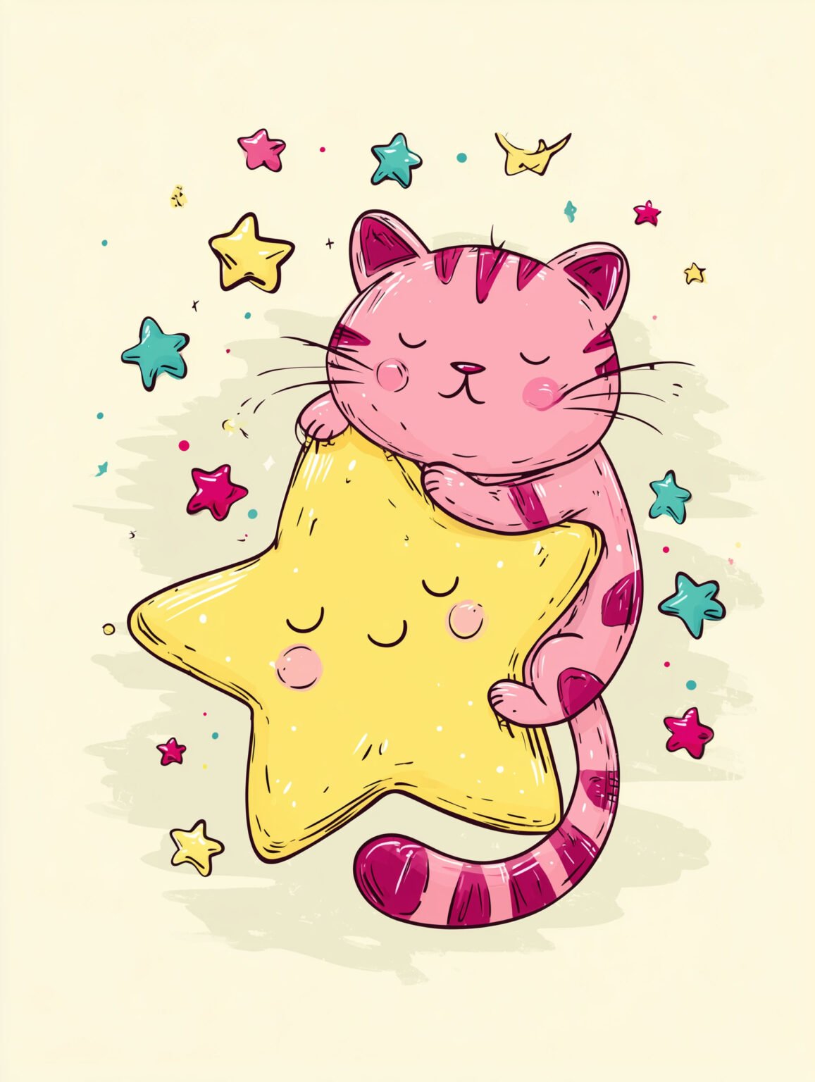 Pink cat with glowing yellow star Art print of a pink striped cat hugging a smiling star, surrounded by colorful twinkling stars. Perfect for nurseries, kids’ bedrooms, or as a gift for cat lovers, this poster adds a whimsical and heartwarming touch to any space.