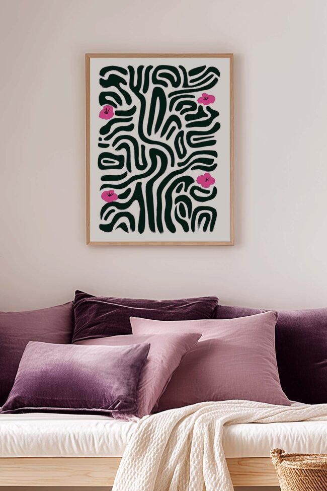Art print with a vintage wedding car seen from behind, decorated with flowers and greenery. The motif shows the car parked under soft white clouds, creating a romantic and nostalgic feel. Perfect for bedrooms, living rooms, or as a heartfelt gift, it brings warmth, romance, and a touch of storybook charm to any interior.