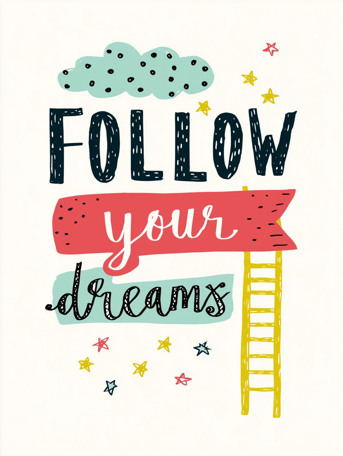 Colorful art print with the phrase Follow Your Dreams in cheerful hand-drawn typography. Bold dark letters sit on a bright pink banner, accompanied by a turquoise cloud and scattered whimsical stars.